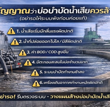 บทนำ หลายโรงงานมัก “รอให้มีปัญหา” ก่อนค่อยล้างบ่อบำบัด ซึ่งจริงๆ แล้วเป็นความเสี่ยงสูงมาก เพราะเมื่อระบบเริ่มมีอาการผิดปกติ นั่นหมายความว่า “บ่อบำบัดของคุณกำลังทำงานไม่เต็มประสิทธิภาพแล้ว” บทความนี้จะช่วยให้คุณเช็คได้ทันทีว่า ถึงเวลาต้อง ล้างบ่อบำบัด หรือยัง